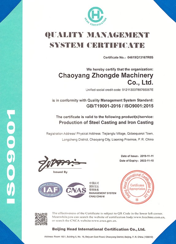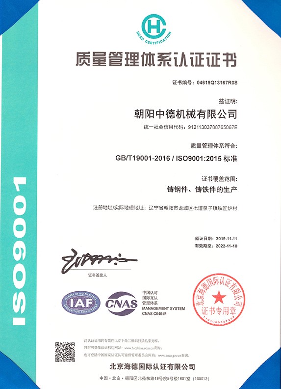 朝陽中德機械有限公司座落于有著“東方佛都”之稱的三燕古都,歷史文化名城——朝陽,具體位置朝陽市龍城區(qū)七道泉子鎮(zhèn)鐵匠爐村。公司創(chuàng)建于2006年5月是一家以鑄鋼件、鑄鐵件,集按用途設計、開發(fā)、生產(chǎn)、銷售于一體的,為機械設備配套的生產(chǎn)型公司。公司注冊資金1000萬,固定資產(chǎn)投資1480萬元,主要生產(chǎn)設備GGW-5T,GGW-10T,GGW-10T中頻感應爐;GDY-13C高溫電阻窯、GDY-9.5C電阻窯,M4000型直讀光譜儀,DP-3985型硬度測試儀,倒置式金相顯微鏡、拉伸試驗機、超生波探傷儀,檢測手段完備。